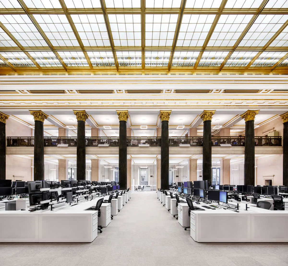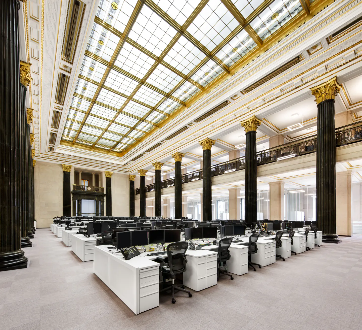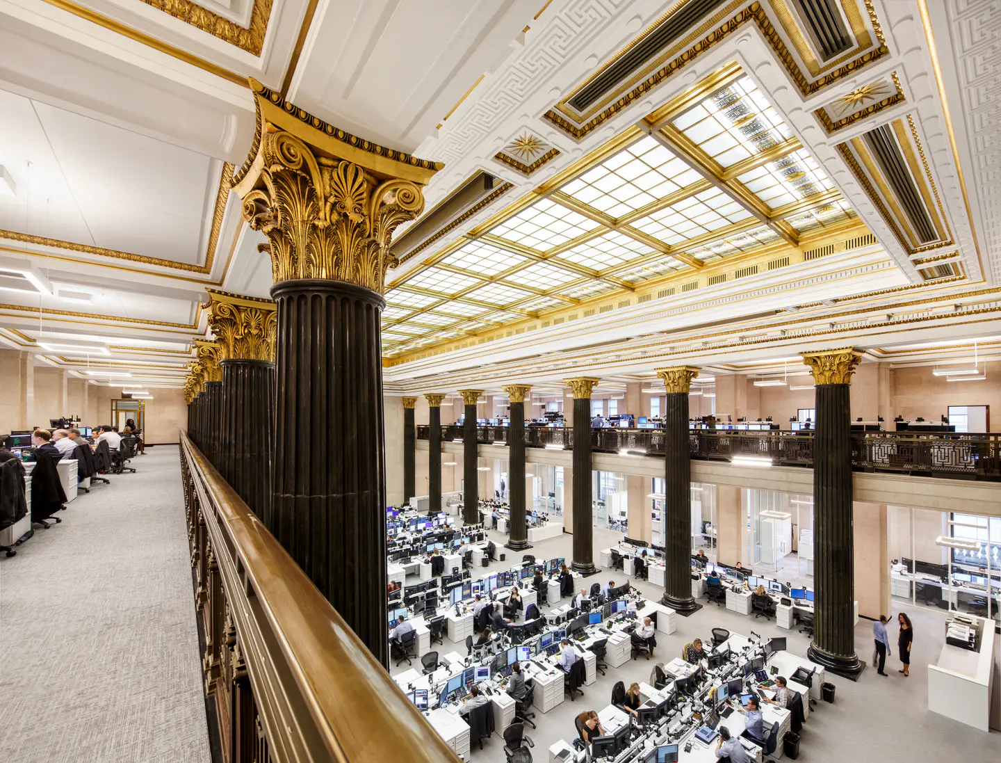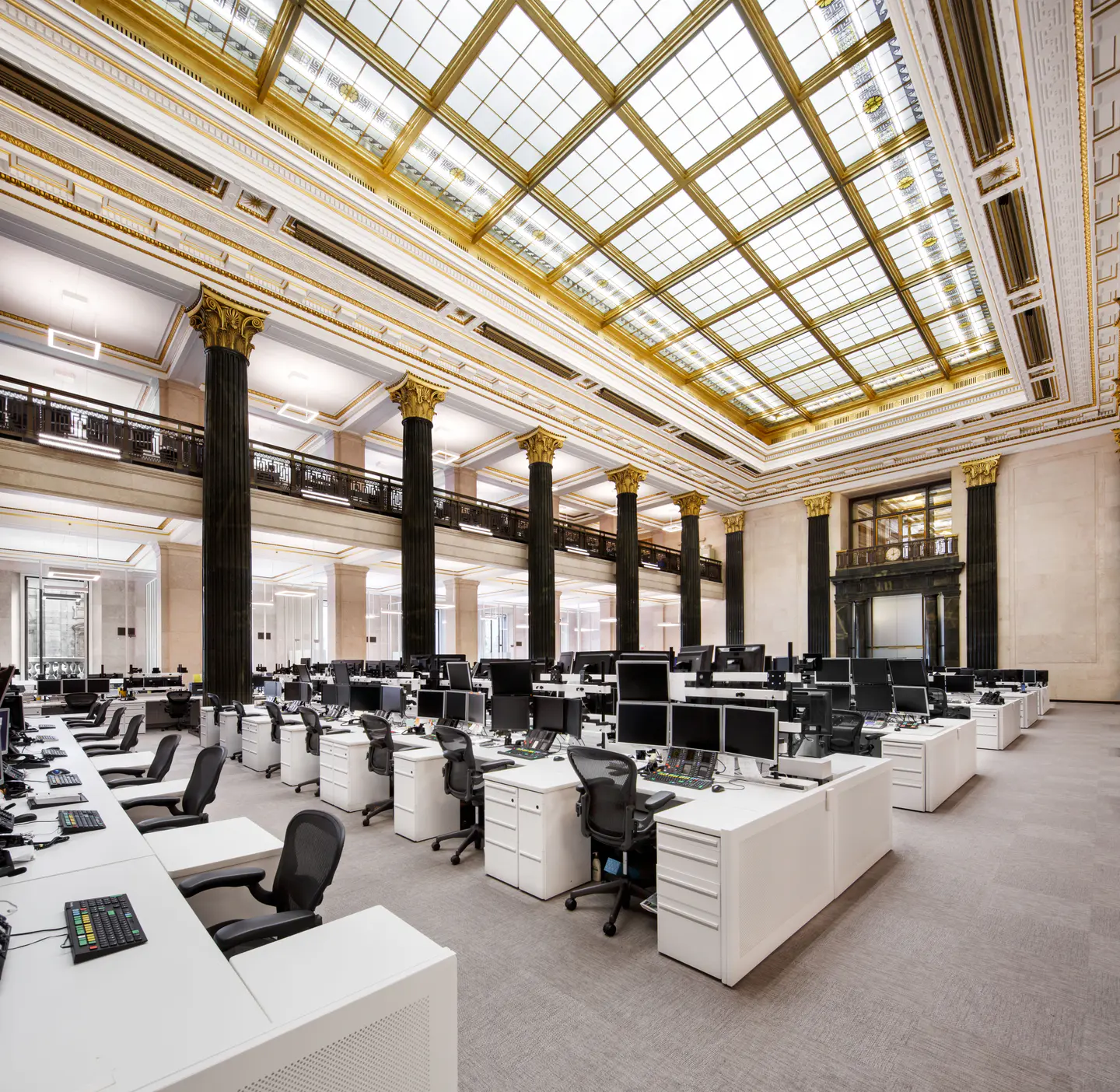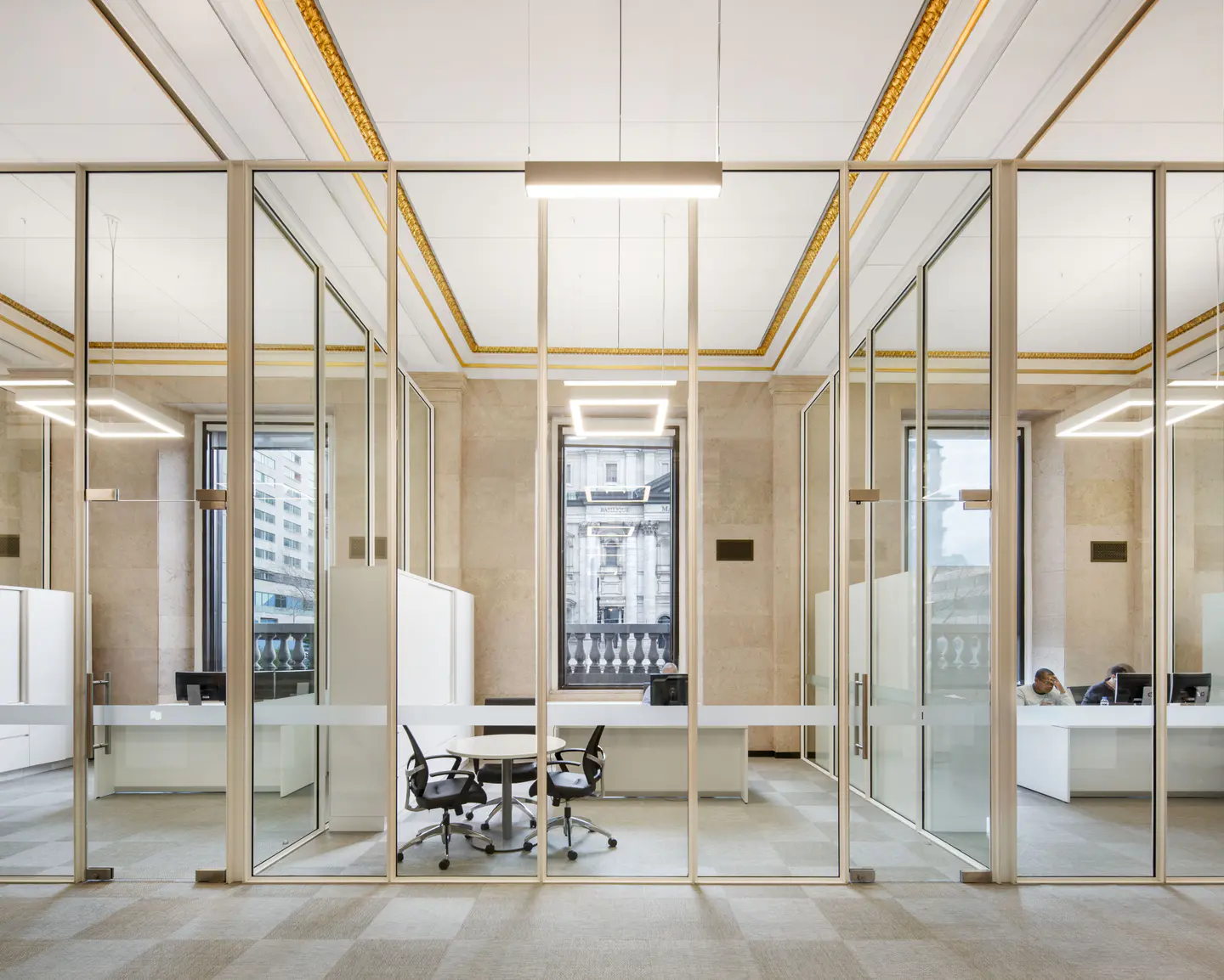 Réaménagement complet de la salle des cambistes dans l'édifice Sun Life, emblème patrimonial construit en 1917. Le projet, réparti sur deux étages totalisant plus de 20 000 pi², a intégré vingt nouveaux bureaux tout en respectant l'élégance et l'histoire du lieu.