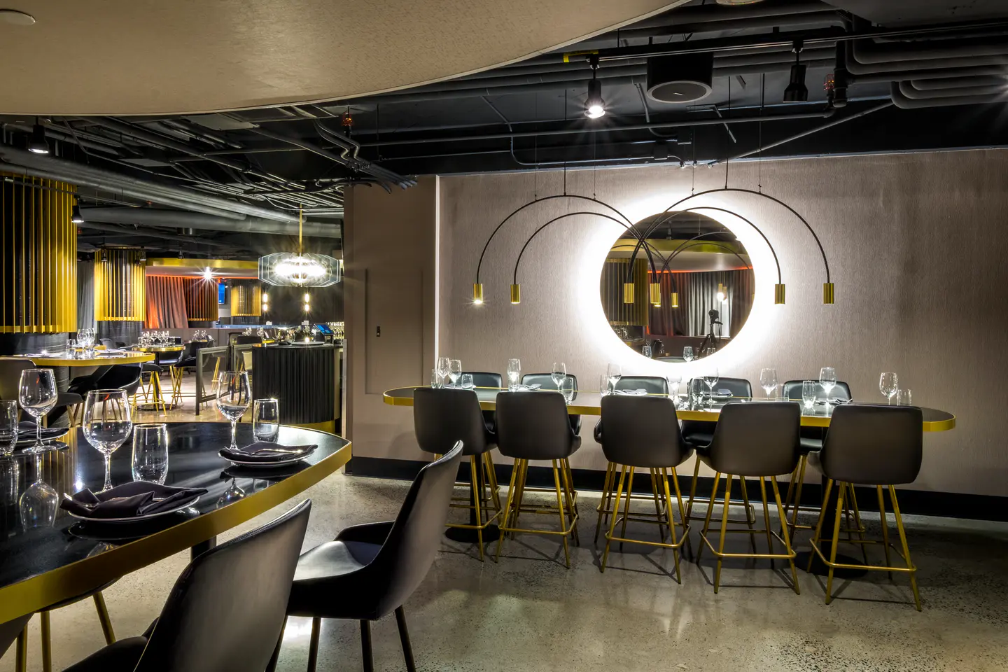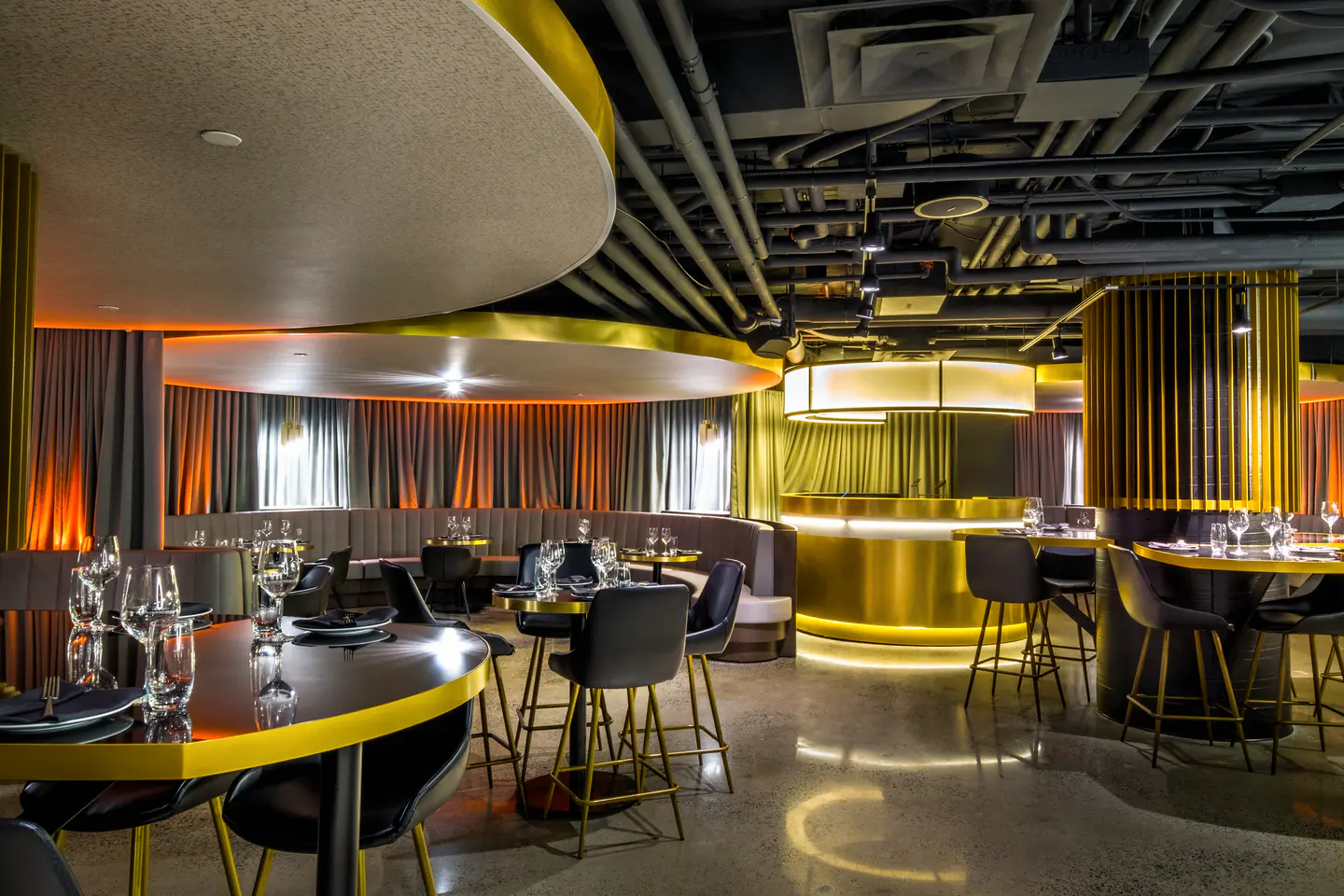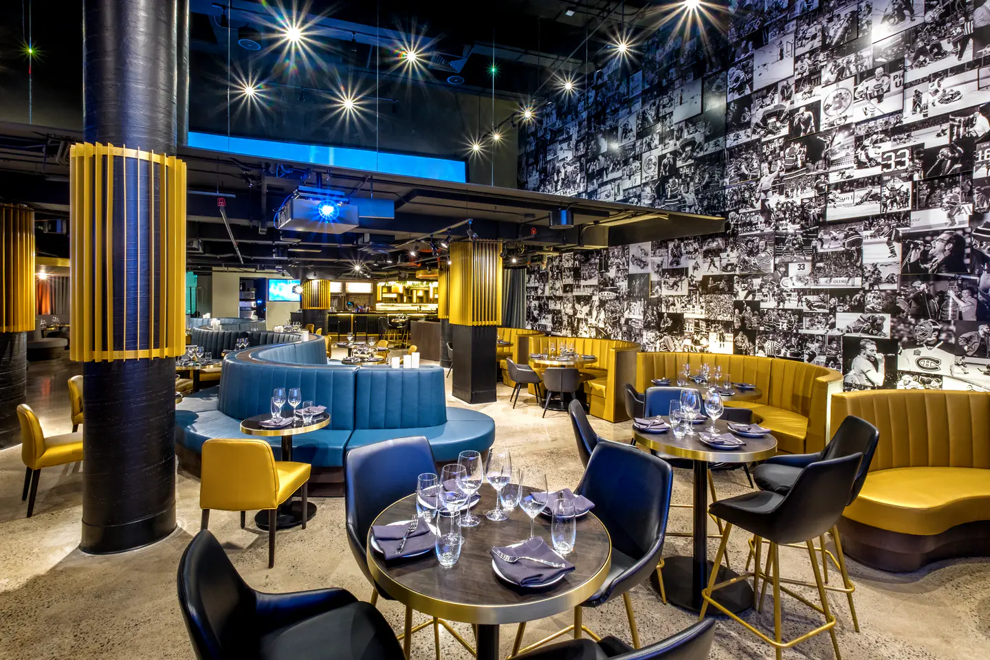 Rénovation complète de l'aire de restauration M2 et aménagement du restaurant Le Mythik au Centre Bell, de nouveaux espaces élégants offrant une expérience culinaire raffinée en marge des événements sportifs et culturels. Le projet mise sur une atmosphère immersive alliant confort, design contemporain et cuisine soignée.