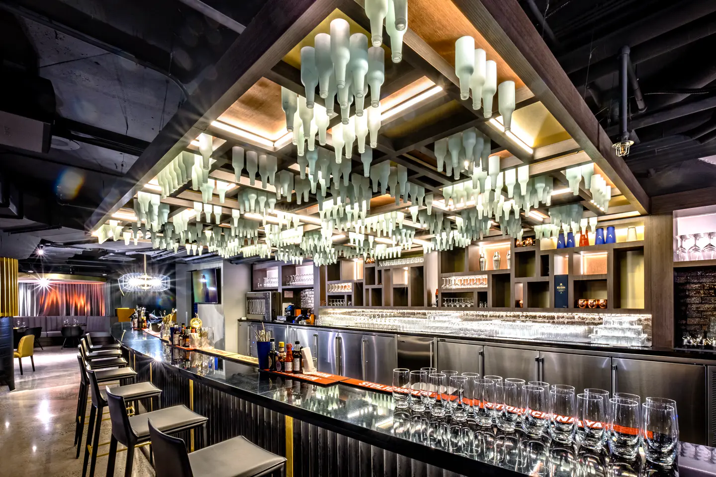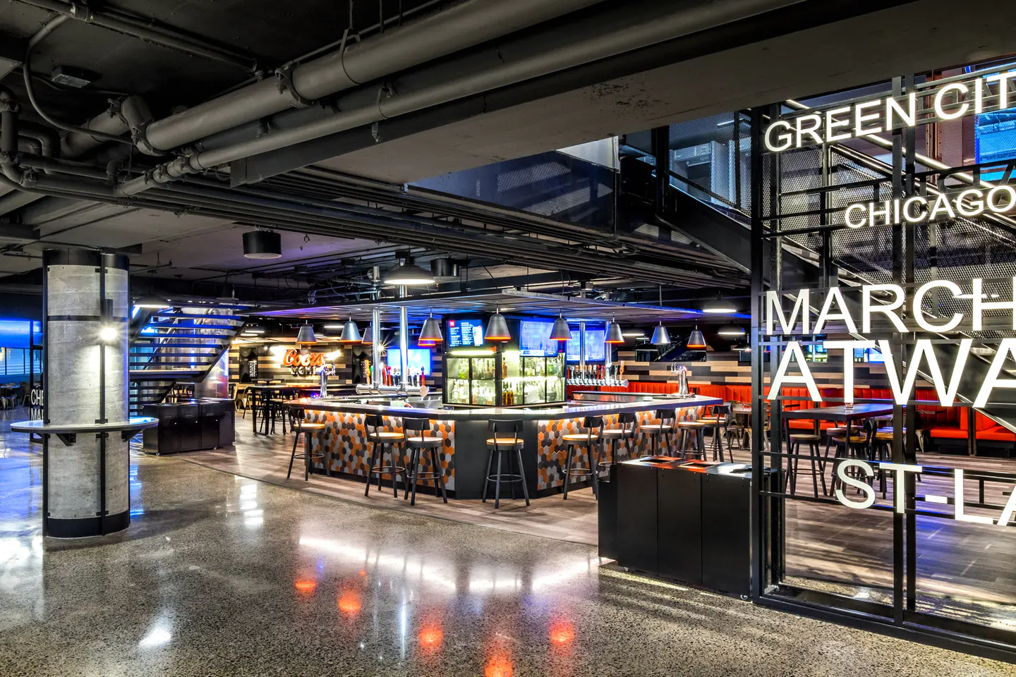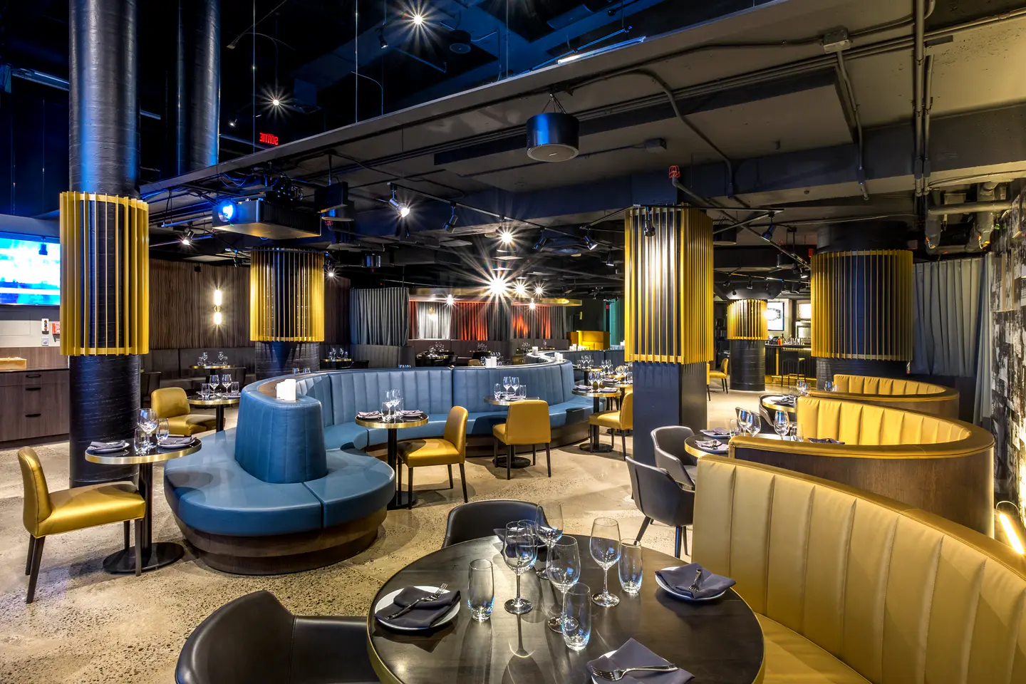 Complete renovation of the M2 food court and the development of Le Mythik restaurant at the Bell Centre, new elegant spaces offering a refined dining experience alongside sporting and cultural events. The project focuses on an immersive atmosphere combining comfort, contemporary design, and refined cuisine.