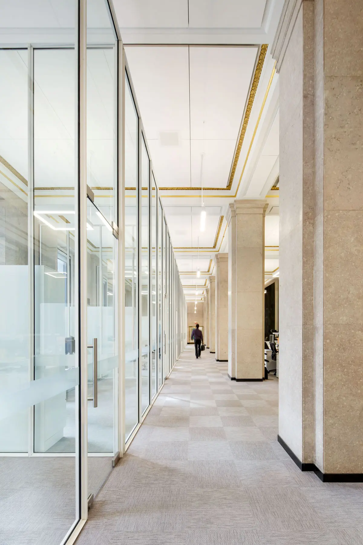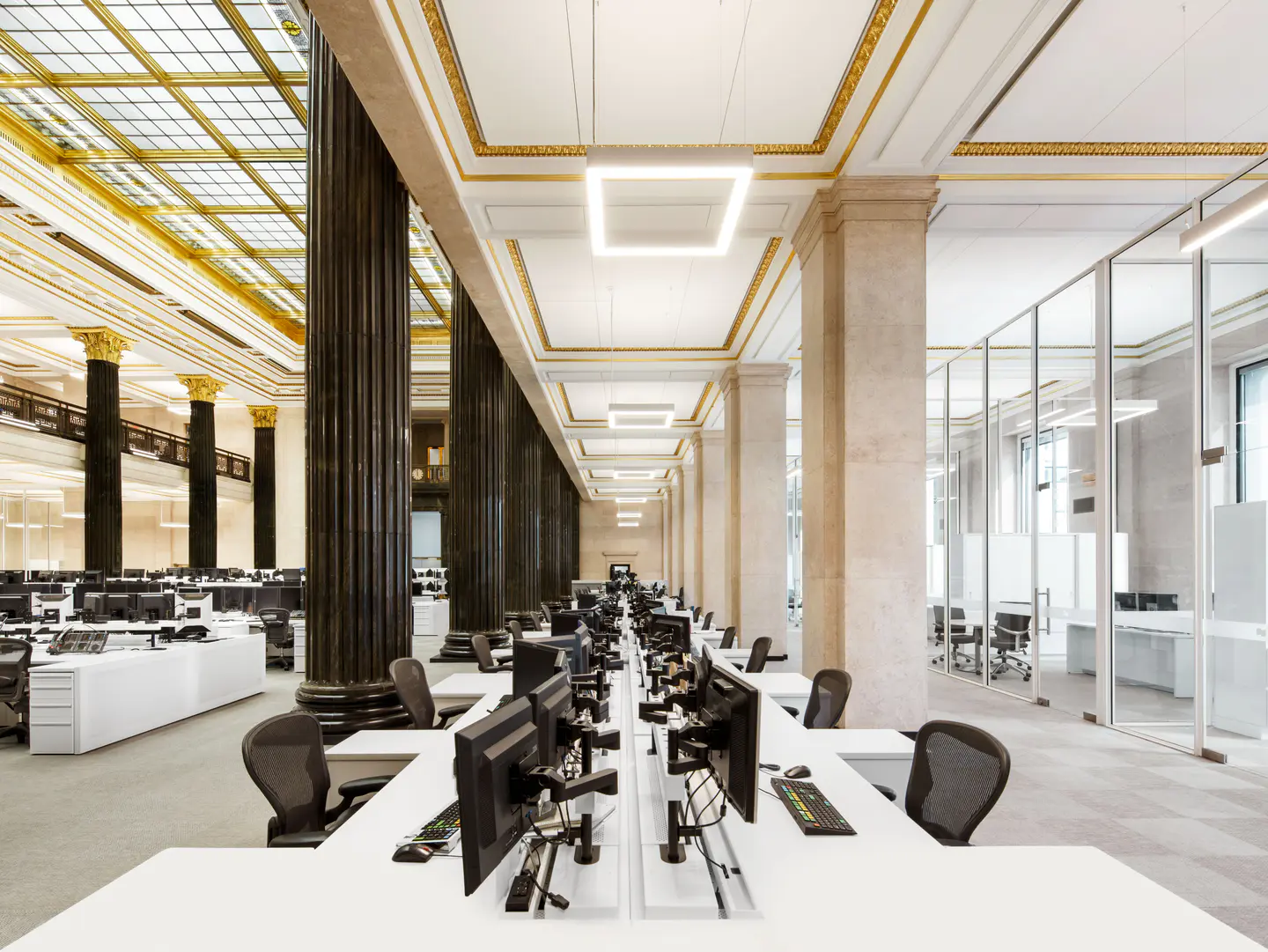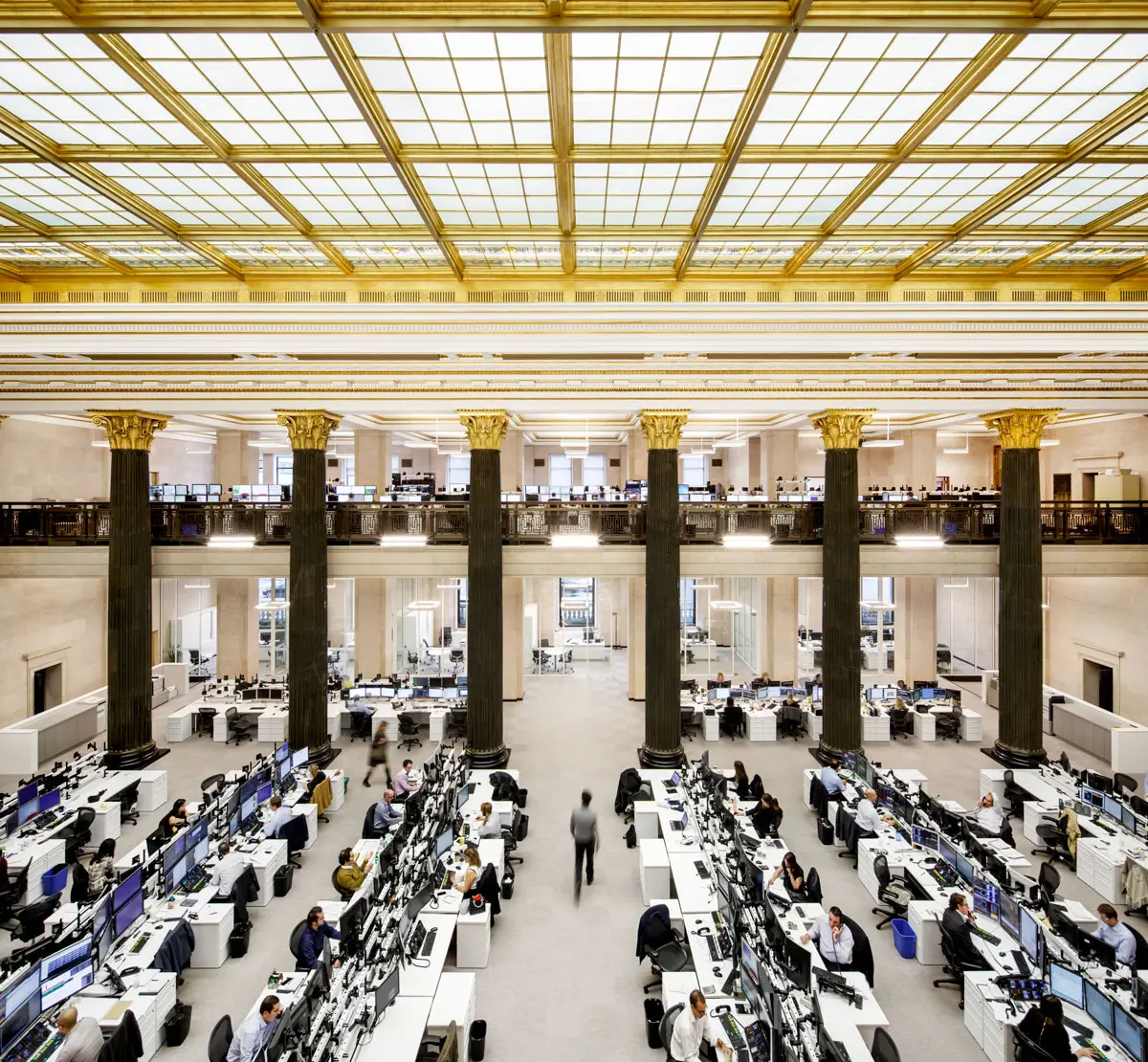 Réaménagement complet de la salle des cambistes dans l'édifice Sun Life, emblème patrimonial construit en 1917. Le projet, réparti sur deux étages totalisant plus de 20 000 pi², a intégré vingt nouveaux bureaux tout en respectant l'élégance et l'histoire du lieu.