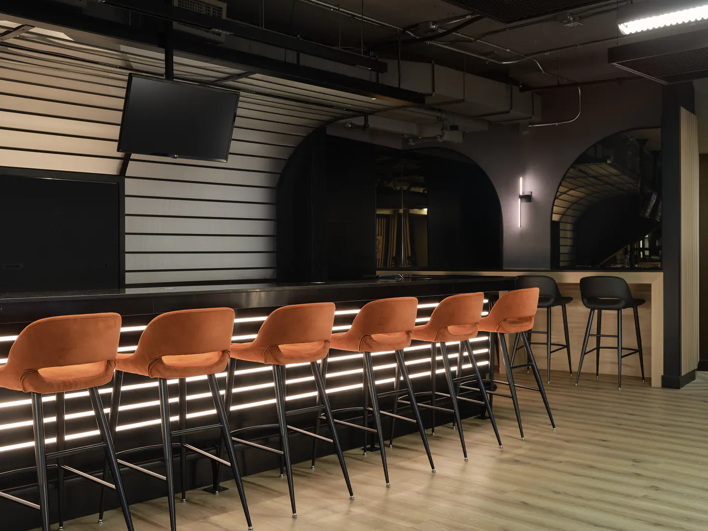 Aménagement d'un nouveau lounge au Centre Bell, situé au niveau de la section Desjardins. Conçu pour rehausser l'expérience des spectateurs, cet espace offre un environnement convivial avec un service optimisé de nourriture et de boissons.
