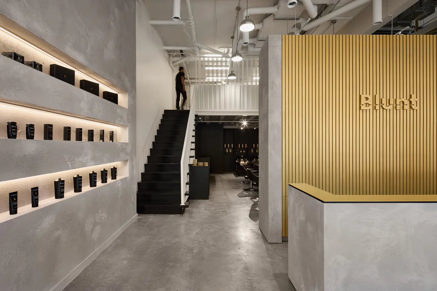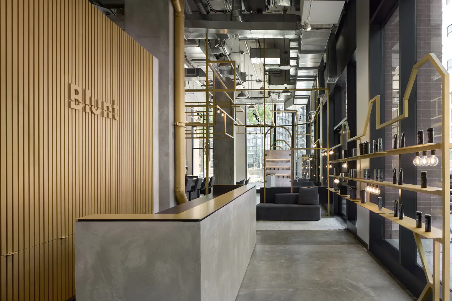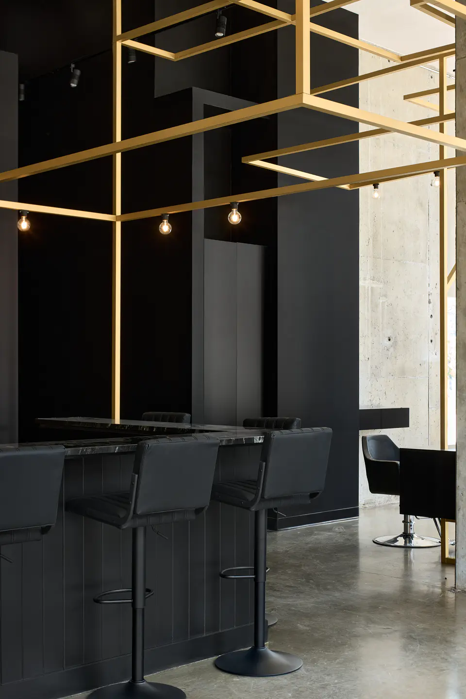 Agrandissement du salon de coiffure Blunt à Griffintown, transformé en un espace moderne et chic. Le projet a permis d'optimiser l'aménagement pour offrir une expérience client haut de gamme dans un environnement raffiné et contemporain.